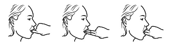 You will need to determine what opening and duration are best for you. To determine this, the first time you stretch, bend your index finger and place the middle knuckle between your upper and lower front teeth (see Figure 1). Hold this position for 30 seconds. If this does not aggravate your symptoms, the second time you stretch, increase the time to 45 seconds. If this does not aggravate your symptoms, the next time increase it to 60 seconds. If this does not aggravate your symptoms, increase your opening width to 2 fingertips (see Figure 2) and cut your time back to 30 seconds. Continue increasing your time and opening in this manner, but do not go beyond 3 finger tips. Find the largest opening and duration that does not cause even the slightest discomfort or aggravation of your symptoms and use this each time you stretch. If you experience any discomfort or aggravation, decrease your opening or time.